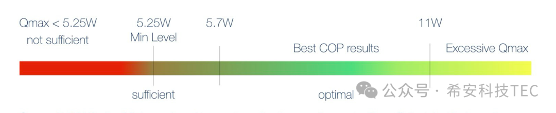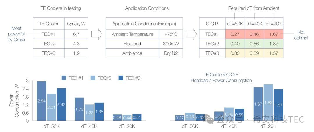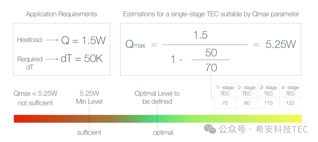 Основни захтеви за избор ТЕЦ: оптерећење Кц, радна температура Тц, температура врућег краја Тх, Дт=Тх-Тц. На пример: Кц=1,5В, Дт=50К, Кмак=1,5(1-50/70)=5,25В. Да ли је овај Кмак 5.25В оптимално решење? Не, 5,25 је најмањи Кмак у овој апликацији. Кмак није нужно што је већи то бољи. Ако је већи, број ПН парова ће бити већи, а сама потрошена енергија ће бити већа. Како израчунати овај оптимални Кмак је прилично компликовано и захтева веома професионалне инжењере топлотног пројектовања.